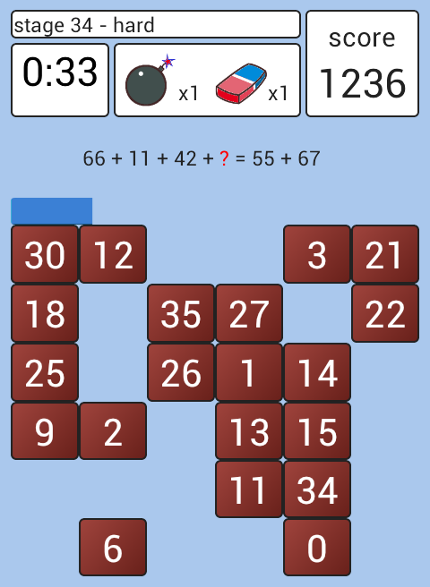 Find in the matrix the suitable number to complete the sum. In each stage, you have to find ten numbers (except in difficulty level "beginner", where you just have to find seven numbers) before time gets to zero. As you progress in the game, the size of the matrix and the number of sums increases.