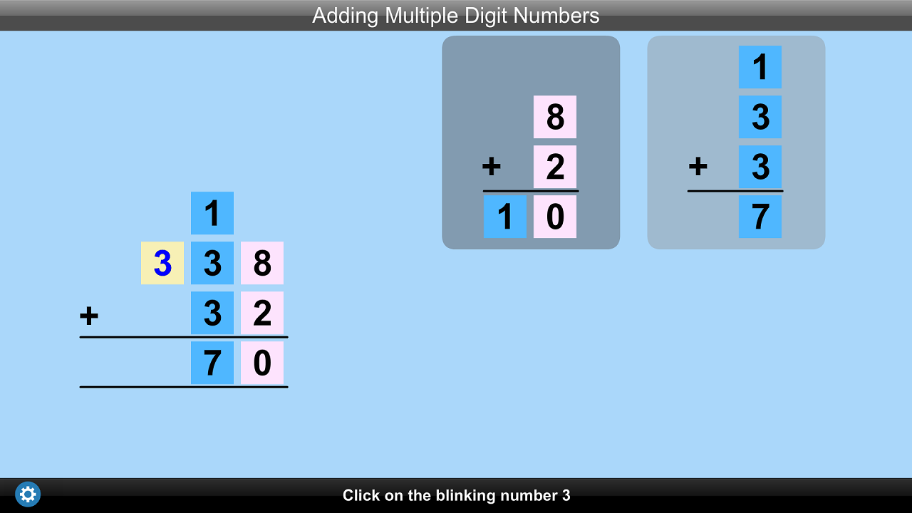 In this program the student clicks on numbers or the plus sign as guided by the computer. This will help the student to learn to do the proper steps in the correct order.