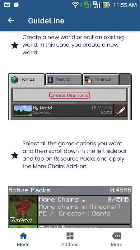 Addons: Dans notre application Addons for Minecraft, tout est absolument gratuit, choisissez simplement vos Addons préférés pour Minecraft et cliquez sur le bouton Ouvrir, le mod sera automatiquement ajouté à votre jeu.