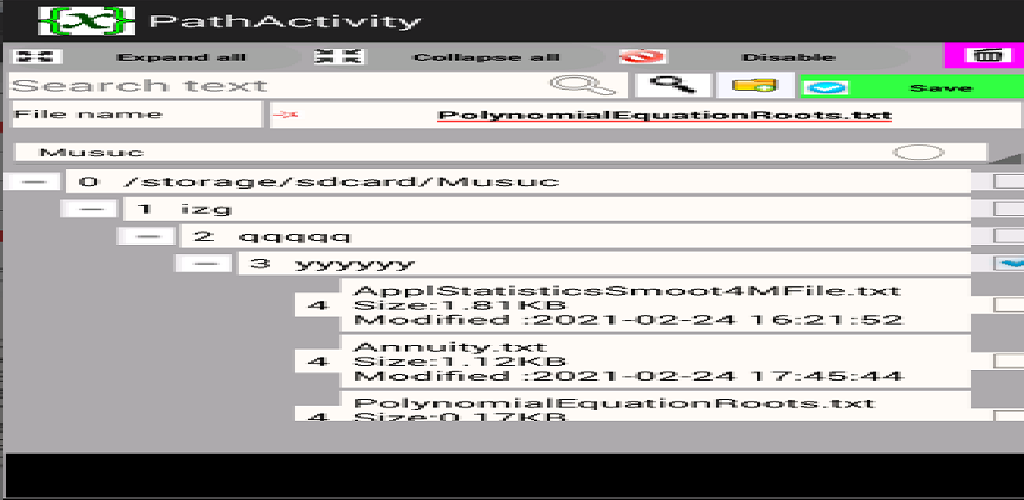 La fonction « Exporter les données pour impression » écrit les données d'une liste d'approximations numériques complètes et d'approximations arrondies des racines dans un fichier polynomialEquationRoots.txt et affiche une boîte de dialogue permettant de choisir une option de stockage localement dans Phonstorage sur l'appareil auquel l'application est ajoutée.