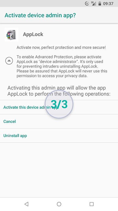 To enable Advanced Protection, please activate Advanced Protection as "device administrator". It's only used for preventing intruders uninstalling AppLock. Please be assured that Advanced Protection will never use this permission to access your privacy data.