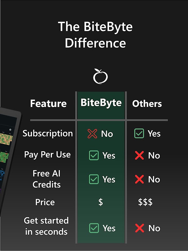 • SANS ABONNEMENT : BiteByte est téléchargeable gratuitement et propose 30 analyses IA gratuites. Un compteur de calories équitable et payant.