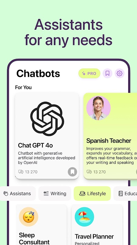 💬 Unlimited Chatbot Access: Engage with the advanced GPT-4, Gemini, GPT-3.5, Claude, Llama, Math Solver, AI Assistants, Business Experts, Translators, Language teachers, and more for an unparalleled chat experience. Ask any question you want and get accurate answers. Your ultimate Smart Assistant awaits with infinite possibilities!