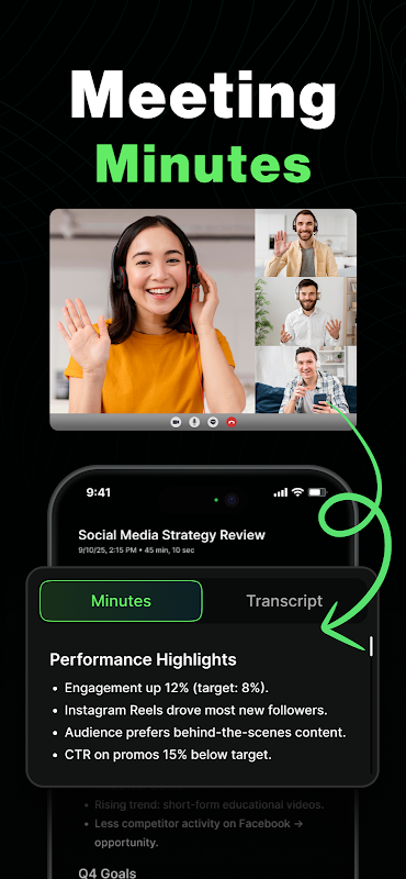 Transformez n'importe quelle réunion en notes claires grâce à AI Note Taker. L'application crée des comptes rendus de réunion structurés grâce à AI Note Taker, garantissant la capture de chaque détail. Utilisez le transcripteur de l'enregistreur de réunion pour générer des transcriptions de comptes rendus IA et simplifier le processus de synthèse de vos réunions.
