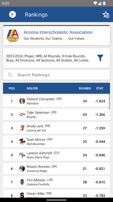 Après les tournois sont finalisés, les classements de l'Etat, régional et local sont automatiquement mis à jour pour montrer comment les équipes et les golfeurs se comparent à leurs concurrents. Les statistiques sont capturées et agrégées sur l'application mobile de sorte les entraîneurs, les joueurs et les spectateurs peuvent suivre les progrès tout au long de la saison.