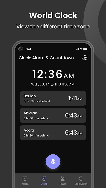 L'application Clock : Alarm & Countdown vous aide à gérer votre temps efficacement grâce à des fonctionnalités telles que des alarmes, une horloge mondiale, des minuteries et un chronomètre.