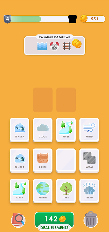 Créez des combinaisons en faisant glisser une carte élémentaire sur une autre pour gagner des pièces et débloquer un nouvel élément. Achetez de nouveaux éléments aléatoires pour votre plateau avec ces pièces.