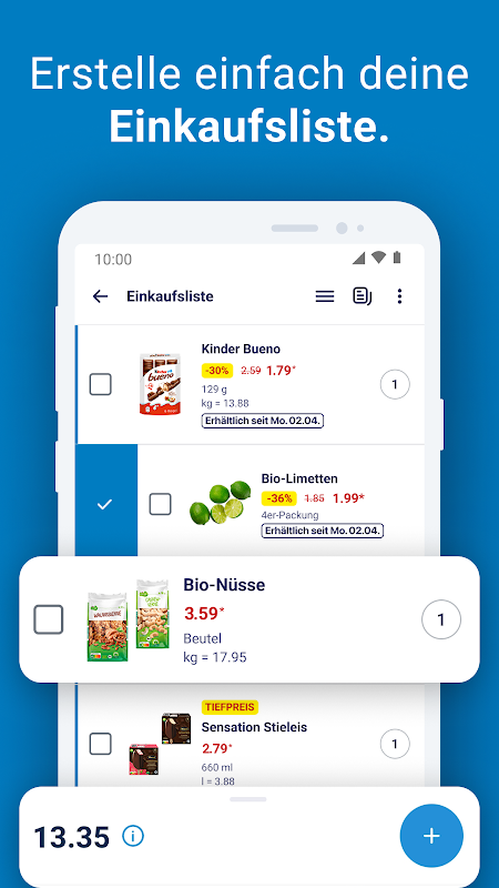 La liste de courses de l'application ALDI Nord vous offre tout ce dont vous avez besoin pour organiser parfaitement vos courses. Elle affiche les prix, les offres du moment et les formats, pour que vous trouviez toujours le meilleur produit. Et grâce à l'affichage du prix total, vous maîtrisez votre budget. Créez une ou plusieurs listes de courses pour chaque occasion.