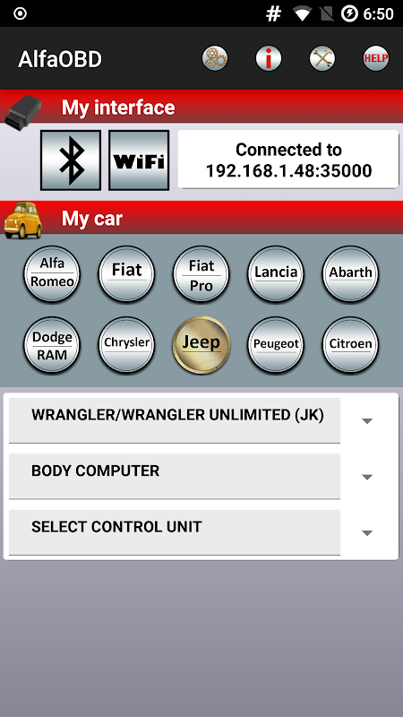 Pour les détails de configuration de la connexion à l'interface et à la voiture, voir l'aide de l'application disponible sur http://www.alfaobd.com/AlfaOBD_Android_Help.pdf