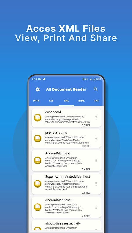 L'application All Document Read/Viewer est un outil polyvalent conçu pour lire et visualiser différents types de documents. Cette application prend en charge une large gamme de formats de fichiers, notamment PDF, DOC, DOCX, PPT, PPTX, XLS, XLSX, TXT, RTF, etc.