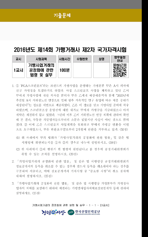 가맹거래사 2차(1교시) 기출문제를 다루고 있으며, 정답을 함께 표현하여 공부하는 시간을 절약 할 수 있습니다.