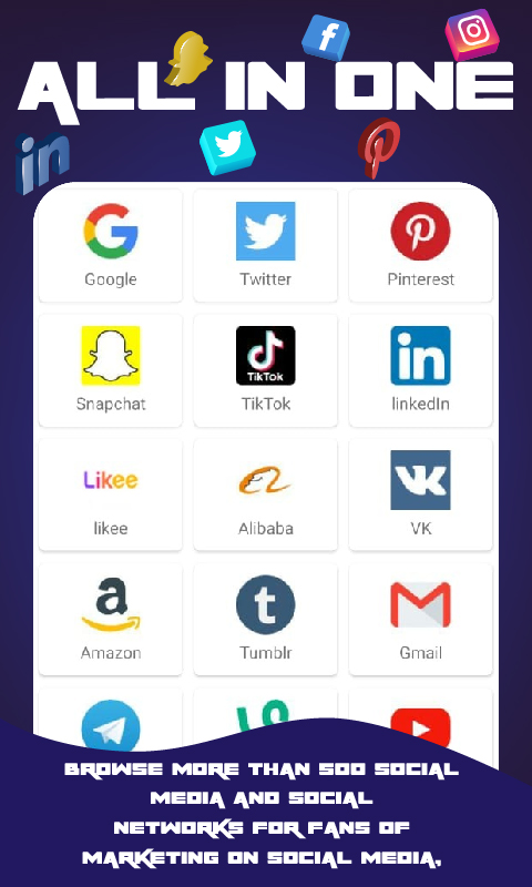 This is a fast, secure, and smart Mobile App Browser, It design for all android device app phone and tablet brings you an amazing web experience for all online users. This browser contains all social media marketing apps, all online shopping apps, and news apps in one place in this web browser.