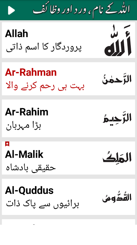 اللہ نام, ورد اور وظائف: اللہ کے ناموں کے اردو معانی اور تفصیل, ورد اور وظائف کے ساتھ. اللہ ناموں کی دلکش آڈیو اور خوبصورت انیمیشن, مخصوصوص ناموں و بک مارک کرنے کی سہولت کے ساتھ.