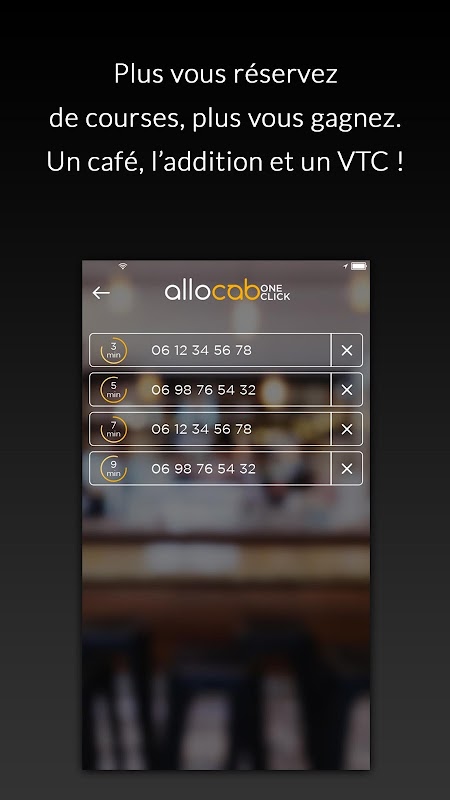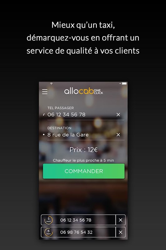 Allocab One click est la seule application VTC qui s'adresse aux professionnels des cafés, bars, hôtels, restaurants, CHR et des établissements recevant du public (musées, théâtres, accueils d’entreprises, salons…) pour la réservation d'un chauffeur à la demande de la clientèle. Proposez un service de transport unique et personnalisé à vos clients en réservant à leur demande un chauffeur privé allocab depuis l’application allocab One Click.