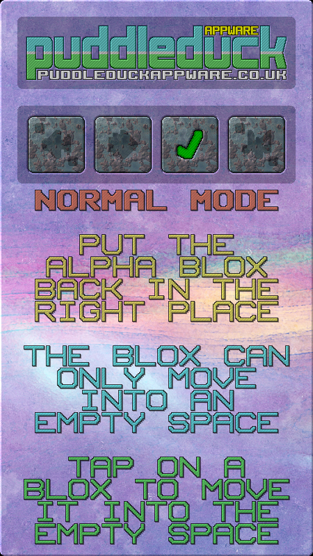 Normal mode : The traditional block slider. Blocks can only be moved into the empty space. The lower option buttons are not used in this mode, so will not appear. Simply tap the block you want to move into the empty space, and if it can, it will.