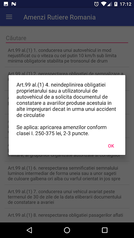 Aplicatia Amenzi Rutiere România permite o vizualizare rapida a amenzilor rutiere, a articolelor si sanctiunea lor. Exista o categorizare usoara cit si divizarea amenzilor pe clase.