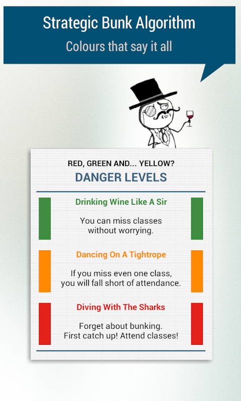 Let the app help you make that decision (We don't want anyone getting debarred now, do we?). It calculates how many classes you can afford to miss or need to attend to maintain your target percentage.