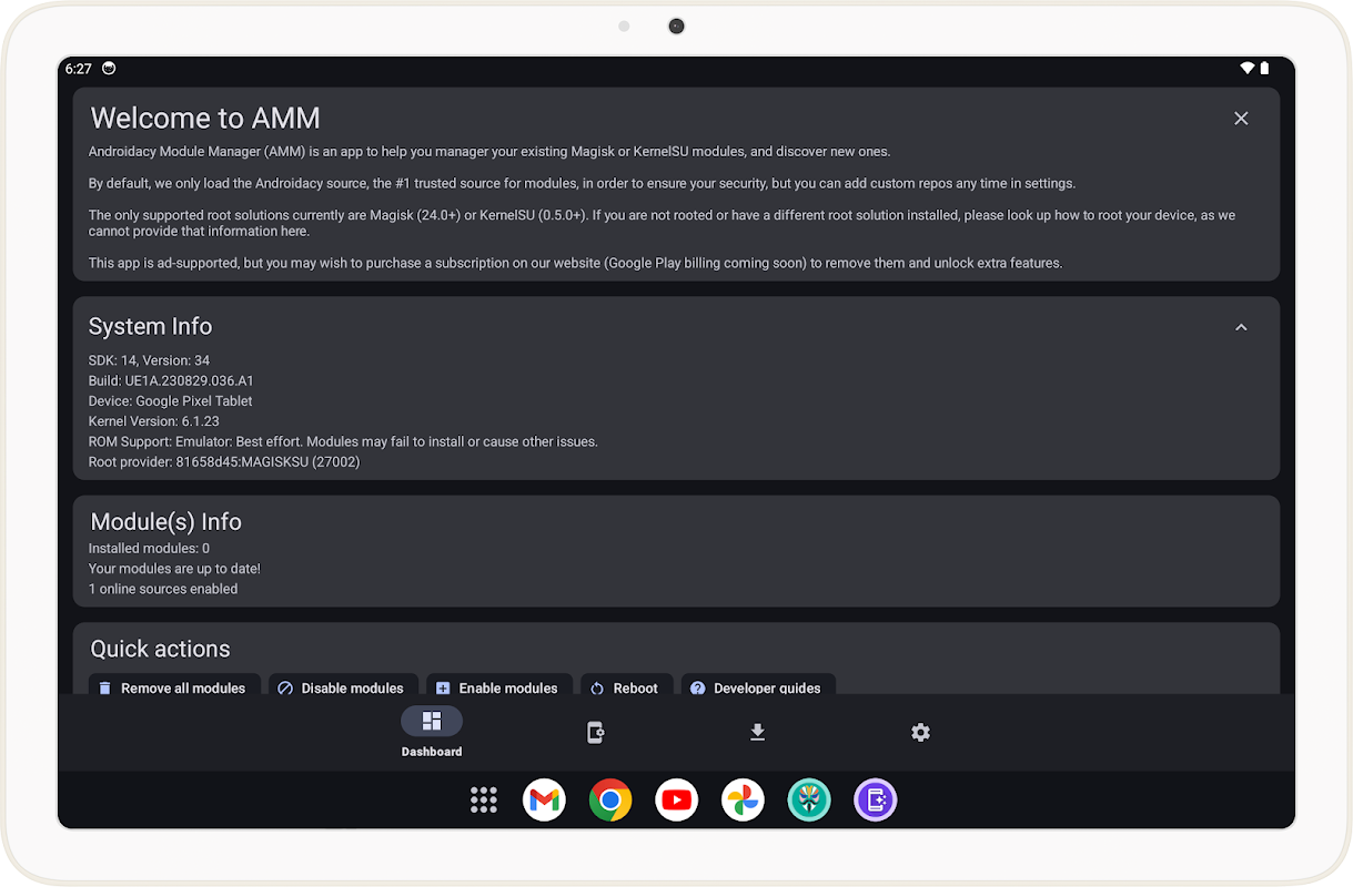 Informations importantes : L'accès root est requis pour l'installation et la gestion des modules. Les appareils non rootés peuvent consulter les modules, mais ne peuvent pas les installer. Le rootage peut annuler votre garantie et entraîner des problèmes système s'il n'est pas effectué correctement. Androidacy ne fournit pas d'assistance pour le rootage. En utilisant cette application, vous acceptez nos conditions d'utilisation disponibles sur www.androidacy.com/terms et notre politique de confidentialité disponible sur www.androidacy.com/privacy. Vous êtes entièrement responsable des modifications apportées à votre appareil.