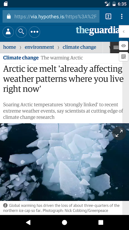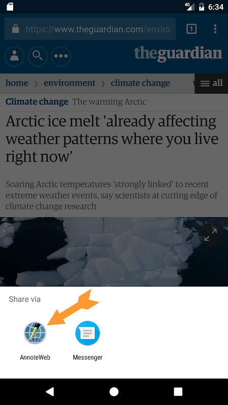 Lorsque vous visualisez une page Web dans un navigateur Web (par exemple, Chrome), utilisez l'action Partager et sélectionnez cette application pour ouvrir cette page Web dans Hypothes.is (en utilisant le navigateur par défaut, pas nécessairement le même navigateur) pour afficher et modifier les annotations.