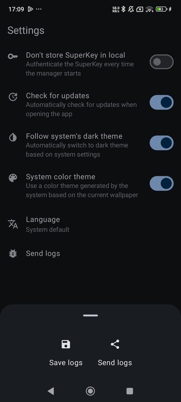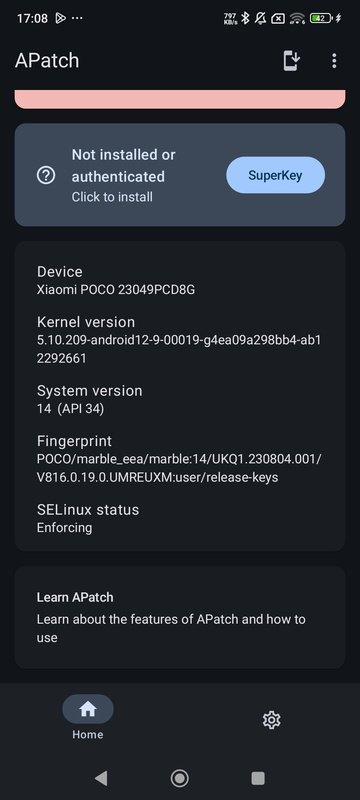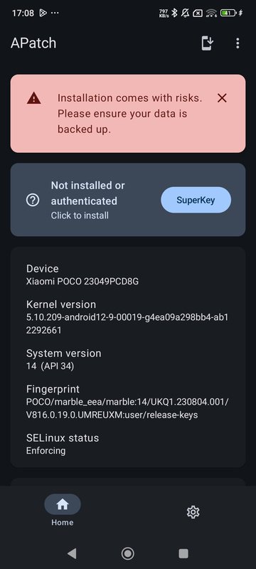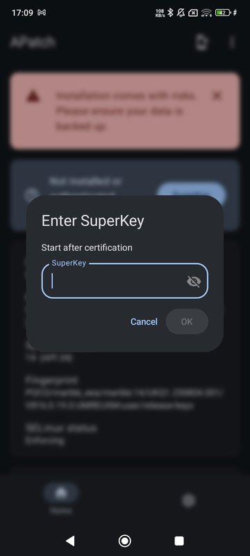 Security, keys, and SuperKey privilegesThe SuperKey system allows you to obtain privileges that go above and beyond traditional root access. For this reason, it is essential to take care with the keys you use for this purpose, as a weak or hacked key can expose your device to unauthorized access. APatch doesn't allow you to set a weak password, and it must be between 8 and 63 characters in length.