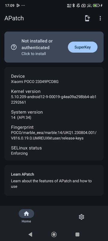 Compatibility and technical requirementsFor APatch to work correctly, your kernel must have the CONFIG_KALLSYMS options enabled and, preferably, CONFIG_KALLSYMS_ALL. APatch is not compatible with Samsung devices with advanced protection.