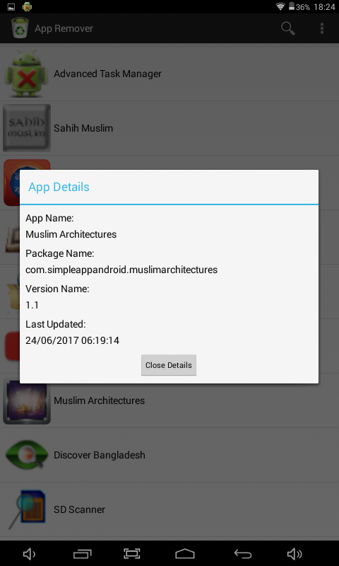 A simple application to remove user applications installed on device. Click an application in the list to view it's details or remove it.