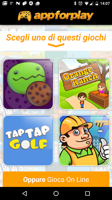 Scopri quali avvincenti giochi arcade sono stati inseriti in un'unica app per farti divertire! Mettiti alla prova in ogni luogo e quando vuoi tu.Con l’avvincente Cookie Chomp, mangia più biscotti che puoi dirigendo il mostriciattolo goloso fino all’arrivo, ma attento a non sbagliare percorso o rimarrai incastrato e perderai una vita. Con il divertente Orange Ranch, fai esplodere tutti i palloncini colorati che tengono intrappolate le tue arance sparandogli con un cannone; raccogli il maggior numero di frutti possibile per poter vendere il tuo raccolto al mercato e guadagnare punti. Tap Tap Golf è un gioco di logica nel quale devi calcolare la traiettoria e la potenza del tiro per centrare in un colpo solo la buca e ottenere il massimo del punteggio. Infine metti alla prova i tuoi riflessi con The Builder: costruisci il grattacielo più alto della città! Attento a non far cadere i blocchi o perderai dei punti, sfida te stesso e batti il tuo record. Hai una connessione internet e tanta voglia di divertirti con gli esclusivi giochi Appforplay? Premendo il tasto “Gioca on line” entrerai in un fantastico mondo di intrattenimento con tantissimi giochi esclusivi e completamente gratuiti.