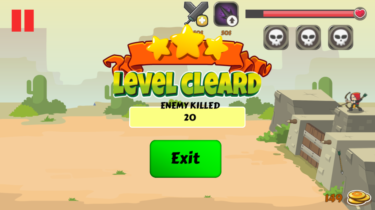 There are so many stages that should be completed to keep the castle safe. If there is some stage that is too hard, there are many unique skill from the archer soldier that can be used to be stronger, to get that skill you have to buy with coin. You can collect the coin by killing the enemies.