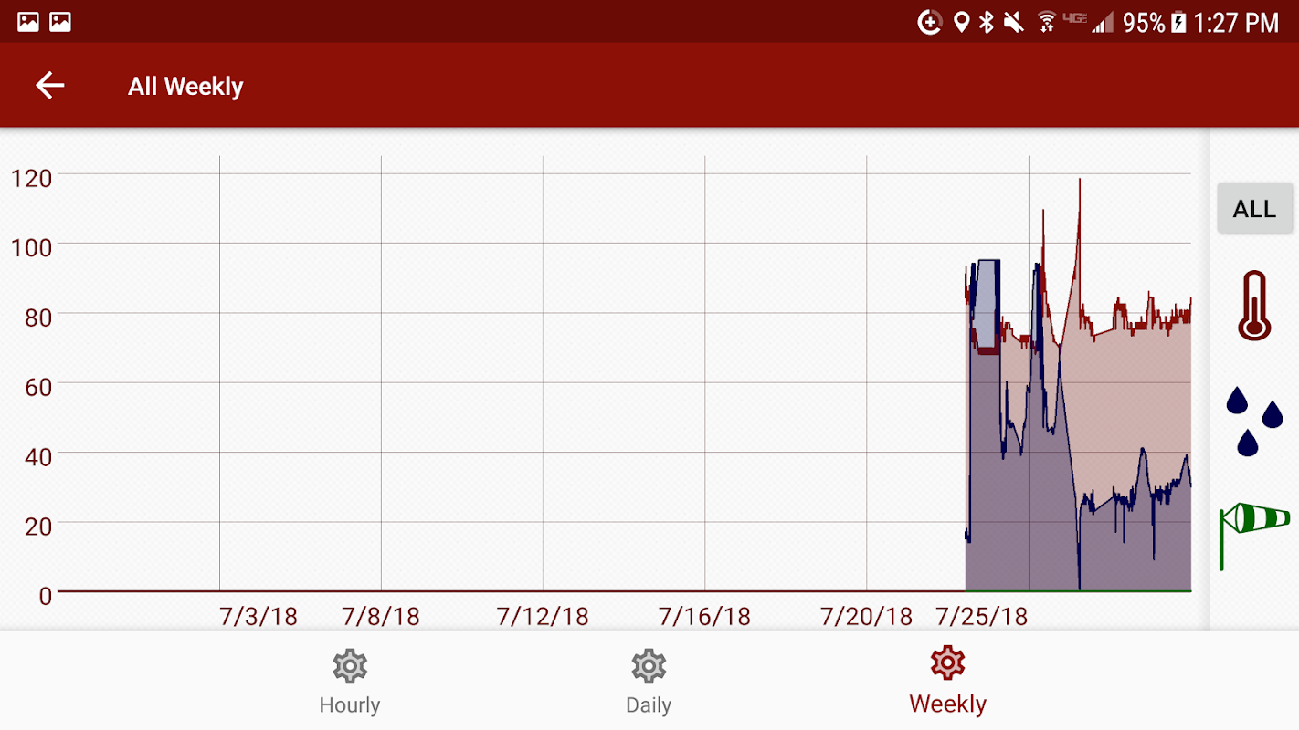 Tapping on the weather panels graph will bring you to full graph view which allows for hourly, daily, and weekly views of the sensors data. The menu symbol correspond to each sensor and the "All" button will give you a view of all sensors.