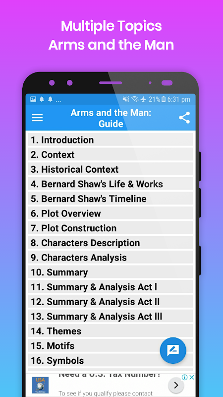 This Guide app works both online and offline, and contains 28 basic topics about one of the famous plays of George Bernard Shaw, Arms and the Man.