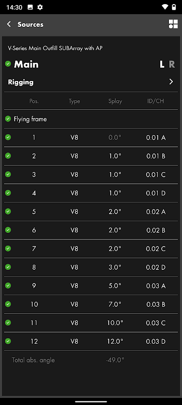 L'application ArrayCalc Viewer fournit des données telles que l'angle d'évasement, le canal amplificateur ID et les informations de câblage, la hauteur du châssis volant et la hauteur du bord le plus bas, l'angle de trame, dans le but horizontal, Pickpoints, le poids et l'état de charge. Toute modification apportée à la conception du système peut être distribué à chaque utilisateur immédiatement, assurant une approche efficace et convivial et facile à utiliser pour le gréement.