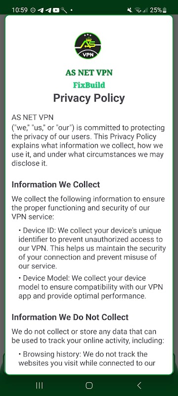 AS NET VPN utilise un service de premier plan pour maintenir une connexion constante et sécurisée. Cela garantit une fonctionnalité VPN ininterrompue, même lorsque l'application est réduite ou en arrière-plan. Les catégories de services de premier plan prédéfinies (comme l'emplacement ou les médias) ne seraient pas adaptées à nos exigences VPN uniques.