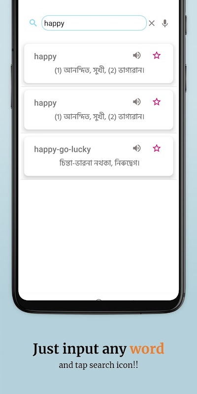 This dictionary contains 45,000+ words. To learn any word, just input in the search box and hit search. You can also search words using voice search. A word can be searched just by entering a few letters of the word and it will return all related words and their meanings.