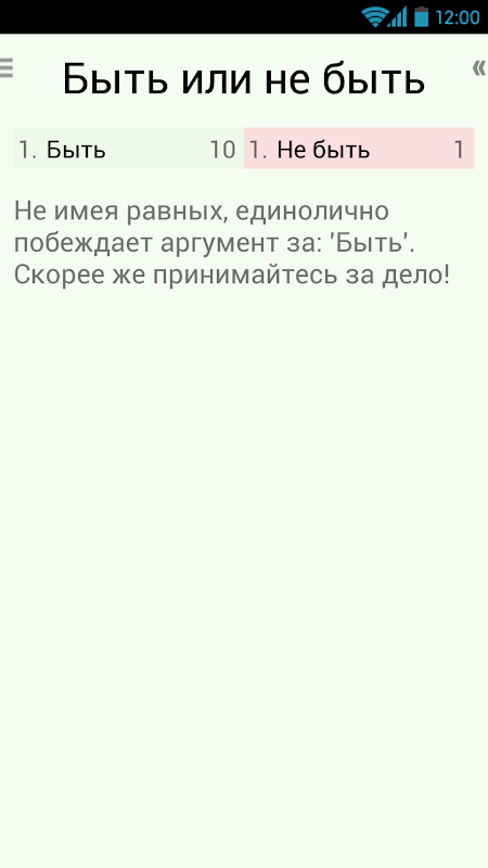 Обычные способы оценки за или против предполагают сравнение лишь количества аргументов, а вес каждого из аргументов не берется в сравнение. Ведь порой один аргумент стоит сотни других. Assistant Decisions реализует уникальный метод поиска решений на основе веса каждого из аргументов. В результате Вы будете иметь на 100% больше взвешенных решений. Когда даже одно из этих решений может стоить миллионы. И по обычной методике оно было бы отброшено. Подумайте над этим.. У каждого из нас есть гениальные идеи и иногда необходимо только одно слово поддержки, и тогда на сцену выйдет новый Бренд телефонов, или будет создан новый Супермаркет только без очередей в кассу. Если Вам важно принимать действительно взвешенные решения, то Assistant Decisions будет лучшим для Вас помощником.