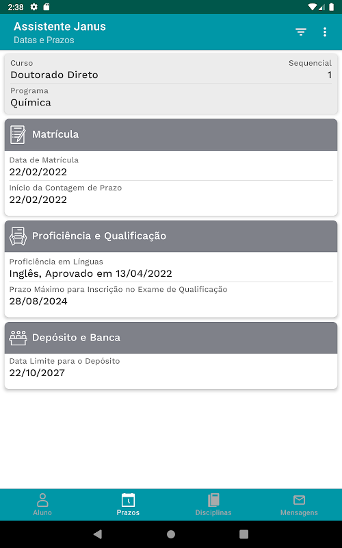 L'assistant Janus est la nouvelle application du doyen des études supérieures à l'Université de São Paulo qui vise à aider l'étudiant diplômé de l'USP à suivre les informations de ses activités dans le programme d'études supérieures, donnant l'agilité dans l'interaction entre les étudiants. les étudiants et l'université. Grâce à lui, l'étudiant sera en mesure de suivre les informations de son cours et de son programme, ses dates limites dans le programme de troisième cycle et recevra des notifications à leur sujet, pourra vérifier les informations sur les cours suivis et inscrits et pourra suivre le nombre de crédits dont il a besoin pour terminer le programme.