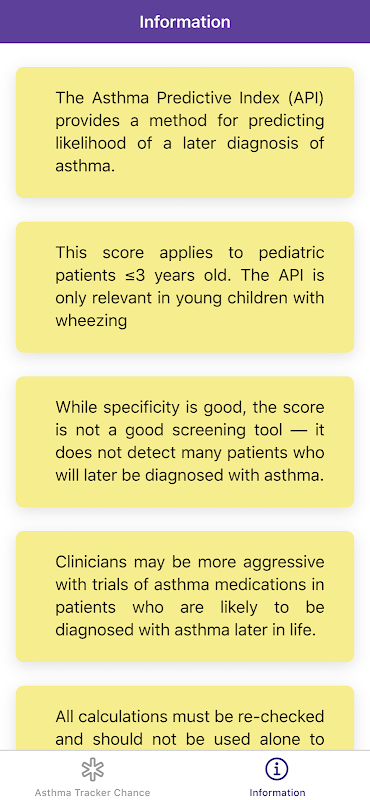 Avis de non-responsabilité: tous les calculs doivent être revérifiés et ne doivent pas être utilisés seuls pour guider les soins aux patients, ni se substituer au jugement clinique. Les calculs de l'application «Asthma Tracker Chance - Asthma Predictive Index» peuvent différer selon votre pratique locale. Consulter un médecin expert chaque fois que nécessaire.