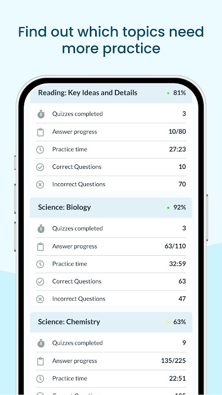Réduisez considérablement votre temps d'étude grâce aux plans d'apprentissage intelligents de notre application. Les questions d'entraînement dynamiques s'adaptent à votre progression et deviennent progressivement plus difficiles. Étudiez sans stress et adaptez votre préparation à l'examen TEAS à votre style d'apprentissage préféré. Que vous révisiez les exercices ATI ou que vous passiez les tests d'entraînement complets aux examens TEAS, nous sommes là pour vous.