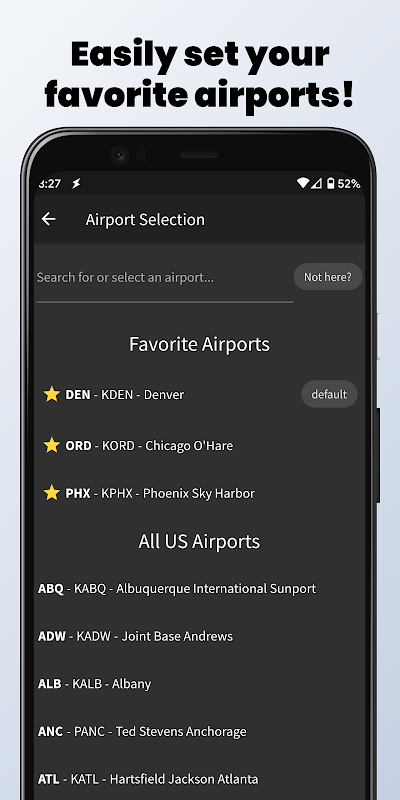 Vous pouvez facilement définir un aéroport "par défaut" qui se chargera automatiquement chaque fois que vous lancerez l'application, et vous pouvez mettre en favoris plusieurs aéroports pour un accès facile à vos aérodromes les plus fréquentés.