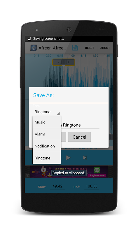 Couper la meilleure partie de votre chanson audio et l'enregistrer comme sonnerie / alarme / fichier musical / tonalité de notification. Les résultats de coupe sont stockés dans "/ mnt / sdcard / media / audio".