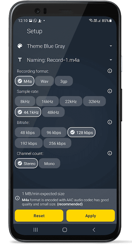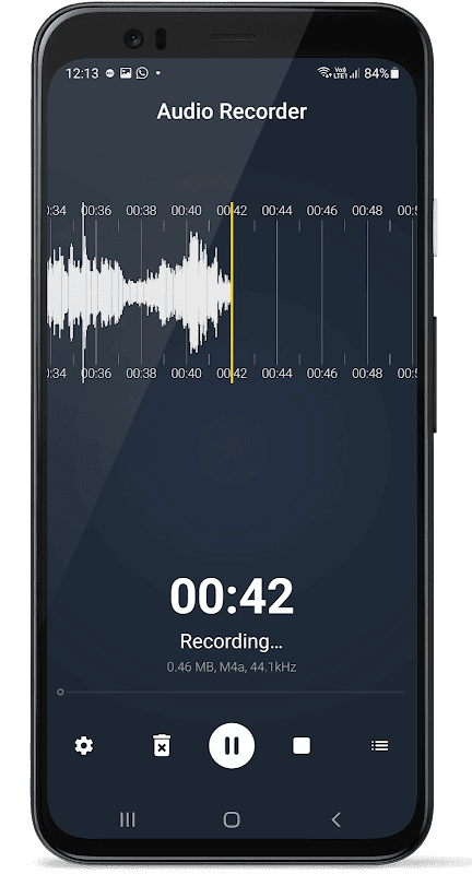 Voice recorder - Audio recorder is the Best recorder for sound recording with high quality (DVD like quality), stereo and long as well as short sessions without time limit. Smallest app size.