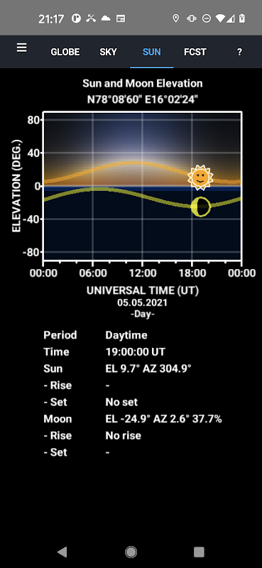 Une boussole Aurora est incluse qui montre où se trouvent l'ovale auroral [1,2], la Lune et le Soleil lorsque vous regardez le ciel depuis votre emplacement. La phase et l'âge de la Lune sont également visualisés dans la boussole. En effectuant un zoom arrière dans le port de vue 3D, les satellites, les étoiles et les planètes apparaissent dans leurs orbites [3] autour du Soleil.
