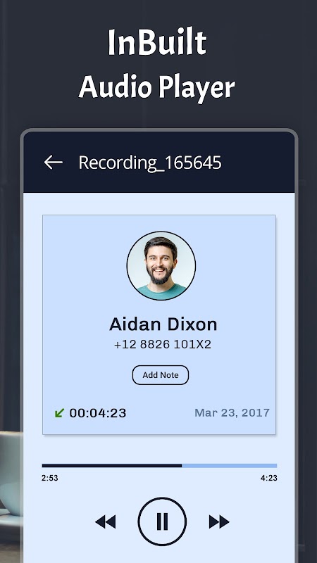 La liste des appels enregistrés sera affichée et rationalisée sur l'écran d'accueil de l'application, vous pourrez trier et démarrer des appels🌟 à votre guise. Vous pouvez gérer vos appels enregistrés, écouter les enregistrements à l'aide de notre lecteur audio intégré, y ajouter des notes et les partager. Ne craignez plus jamais de perdre un détail important. Et on vous l'a dit ? Il est également simple et facile à utiliser😀.