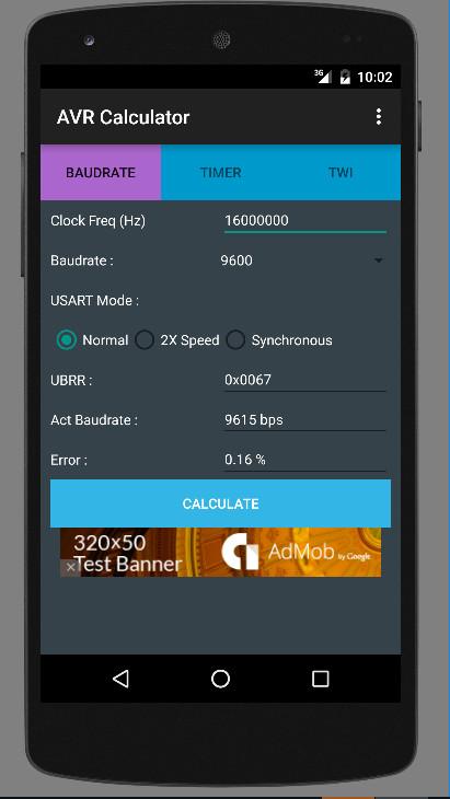 AVR Calculator : Microcontroller Register Calc App can used to calculate register value of AVR Microcontroller. This application support to calculate UBRR register for USART communication. Calculate OCR & TCNT register value of timer. Calculate TWBR register value if you are using TWI communication. Using this app you can easily to configure register value without calculate manually.