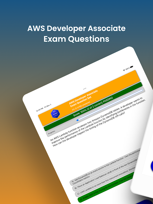 Chaque question fournit un retour immédiat et les réponses correctes, vous permettant d'apprendre efficacement et de vous concentrer sur les notions clés de l'examen AWS Developer Associate.