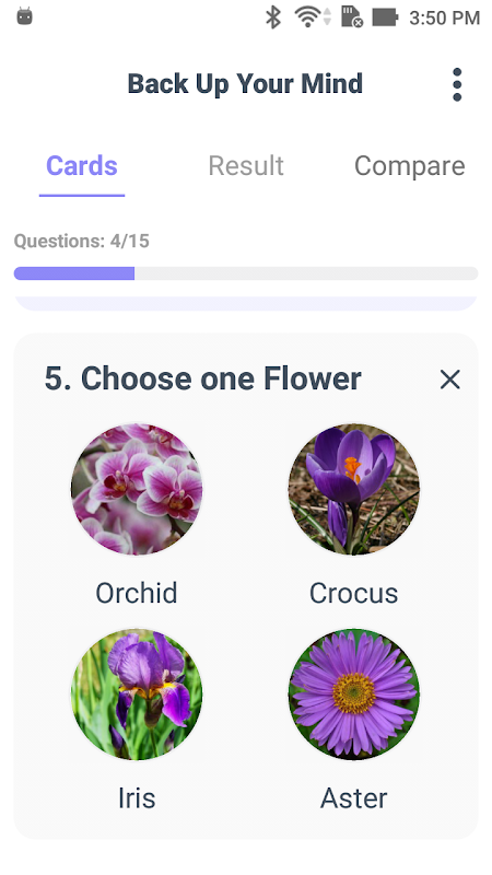 L'application "Back Up Your Mind" est livrée avec une interface conviviale et des onglets clairs pour rendre votre expérience de quiz plus agréable. Mais si vous avez des questions, vous pouvez utiliser notre onglet "Aide". Une variété de questions intéressantes, des images lumineuses et des conseils utiles vous attendent ! Votre objectif principal est de répondre honnêtement aux questions et d'essayer de ne pas les ignorer. Et rappelez-vous que la pertinence de votre profil dépend du nombre de questions répondues.