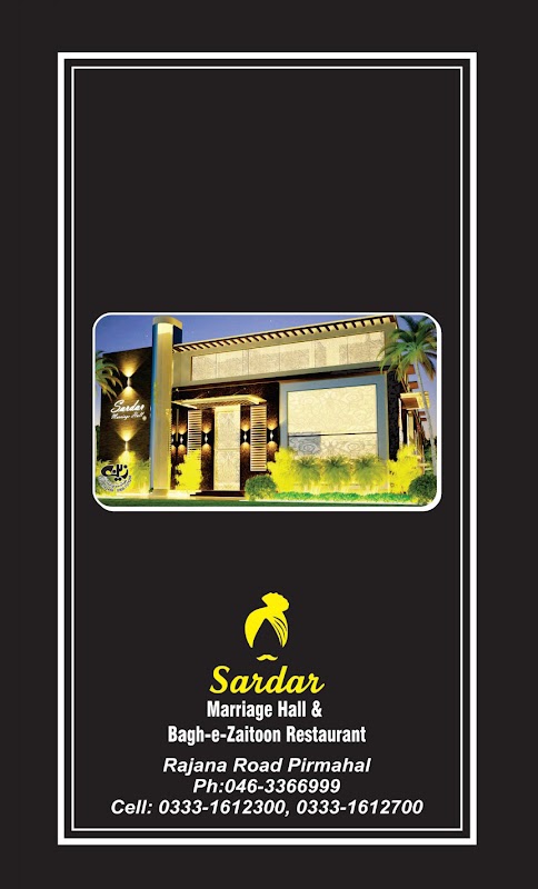 Menu officiel du restaurant Bagh-E-Zaitoon et de la salle des mariages Sardar, Pir Mahal