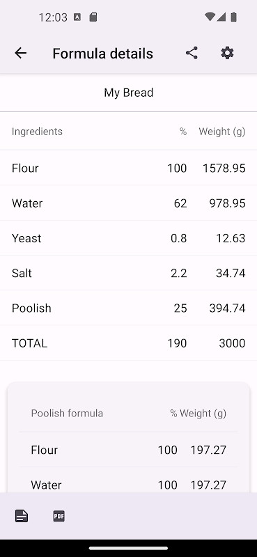 Avec cette application, vous pouvez calculer vos formules de manière professionnelle avec des calculs de pourcentage instantanés pendant que vous saisissez les valeurs. Vous pouvez également réaliser vos propres levains et les ajouter à vos formules, vous pouvez ajouter des garnitures à vos pâtes, vous pouvez ajouter tous les ingrédients dont vous avez besoin, cela vous permet d'ajouter des notes à chaque recette et des notes à chaque levain, vous pouvez enregistrer, modifiez ou supprimez toutes vos formules. Cette application est disponible en 10 langues, dispose d'un moteur de recherche de formules/levains et dispose d'une fonction configurable qui permet de garder l'écran allumé en permanence pour pouvoir travailler sans qu'il bloque et il est également possible de créer des doublons de vos formules ou levains. .