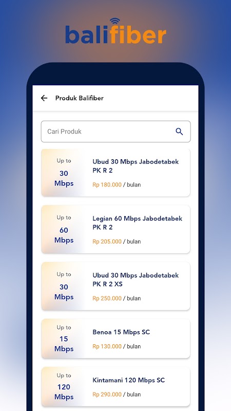 Balifiber propose divers forfaits Internet avec des vitesses et des prix variables en fonction des besoins des clients. Pour la commodité et la fluidité d'Internet, Balifiber est prêt à fournir le service après-vente le plus rapide via les applications Balifiber.