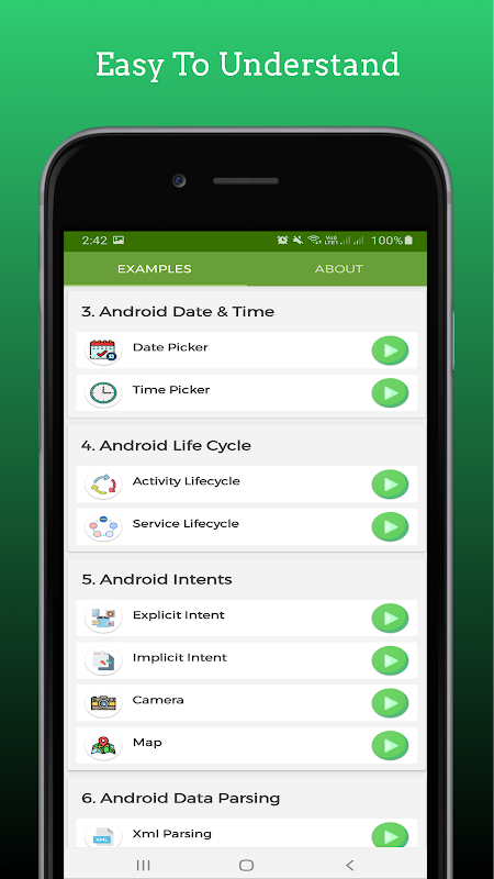 Cette application Android fonctionne des exemples de démonstration. le développeur peut analyser le fonctionnement des exemples Android et le relier au code Android. Lors du développement d'applications pour les utilisateurs d'Android, il suffit de copier et coller les codes dans les fichiers respectifs dans Android Studio. Tous les exemples Android sont essayés et testés dans Android Studio.