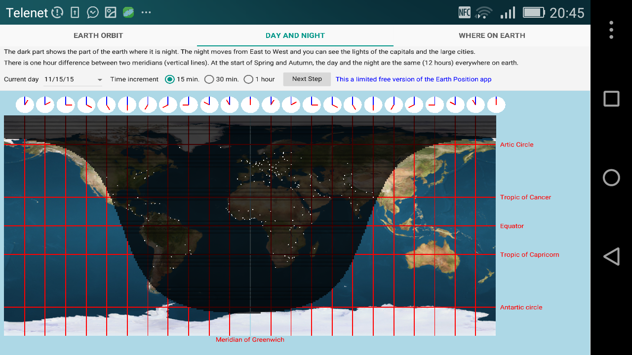 This free version app demonstrates the functions of the full version "Earth Positions" app (see https://play.google.com/store/apps/details?id=com.micriconsult.EarthPos).
